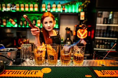 Jägspot to kameralny bar koktajlowy w sercu Gdańska, zlokalizowany przy ul. Świętego Ducha 14b w dzielnicy ożyionej turystycznie i nocnym życiem. Miejsce specjalizuje się w drinkach na bazie Jägermeistera, oferując szeroki wybór autorskich koktajli, w tym wersje bezalkoholowe. Z oceną 4.8/5 na podstawie ponad 1000 opinii w Google, Jägspot cieszy się uznaniem klientów, którzy chwalą tu przede wszystkim profesjonalną obsługę i przemyślane kompozycje smaków. Goście podkreślają miłą atmosferę z myśliwskim klimatem nawiązującym do flagowego trunku – od wystroju po serwowane shoty i karafki mocnych miksów. Barmani, tacy jak Alex, Klaudia czy Adam, chętnie doradzają w wyborze, podając wodę z ogórkiem jako miły gest. Ceny są przystępne, a lokal przyciąga zarówno fanów Jägermeistera, jak i poszukiwaczy nowości, idealnie nadając się na przedklubową rundkę. Klienci doceniają też gadżety promocyjne i czystość wnętrza. Choć zdarzają się pojedyncze uwagi o drobnych niedociągnięciach, jak pomyłka w zamówieniu czy stan łazienki, dominują pozytywne wrażenia. Jägspot to solidny punkt na mapie gdańskich barów dla miłośników koktajli z charakterem. (198 słów)